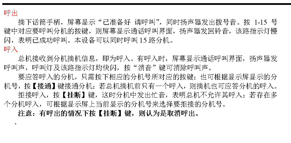 ² 自動掛機:在呼出、呼入或通話結束后,此時無任何呼出、呼入及通話,則總機發出忙音,同時顯示屏顯示“通話結束,請掛機”,要求操作者將話筒掛到掛鉤上。