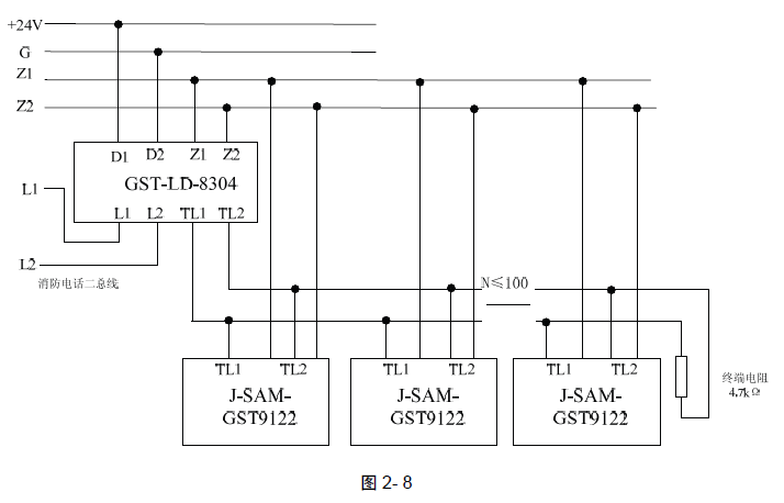 制器總線上,同時將報警按鈕的TL1、TL2 端子與GST-LD-8304 消防電話模塊連接,具體見圖2- 8