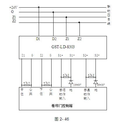 a.模塊與防火卷簾門電氣控制箱(標準型)接線示意圖如圖2-46(無源常開檢線輸入)、圖2-47所示(無源常閉檢線輸入):