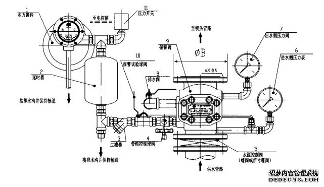 4.1.6、水力警鈴和報警閥的位置,連接的管路在出廠時已經安裝就緒,如需重新安排管路,其水平距離≤20m,高差≤5m.